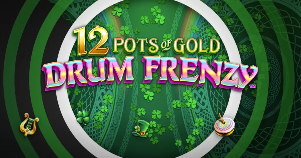 Twee leprechauns staan op een gloeiend smaragdgroen podium, elk volledig opgaand in hun eigen ritme. Achter hen draaien spiraalvormige groene patronen en glimpjes van regenboogbogen, alsof alles zich afspeelt in een draaiende, muzikale droom. Dit is de wereld van 12 Pots of Gold: Drum Frenzy, een titel van Gameburger Studios die terugkeert naar een Iers geïnspireerd rijk, nu aangedreven door percussie, lichtgevende potten en een toren vol oplichtende trommels en potten.